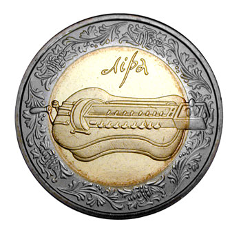 Esta imagen es de la primera moneda bimetalica de esta antigua República Soviética. Se trata de una moneda de 5 Hryven. Esta dedicada como tantas otras monedas acuñadas en el año 2000 al Nuevo Milenio. Tiene un diámetro de 28 milímetros y esta compuesta por una aleación central de oro nórdico (CuAl5Zn5Sn1) y un anillo de cuproníquel, con un peso total de 9,4 gramos. El canto esta parcialmente rayado. Se realizaron un total de 50.000 unidades y su fecha de emisión fue el día 28 de Diciembre de 2000. El diseñador y grabador fue Roman Chaikovskiy. El reverso con su figura de 3 petalos tiene el significado del pasado, presente y futuro. En el anverso la leyenda dice: "al filo de los milenios".